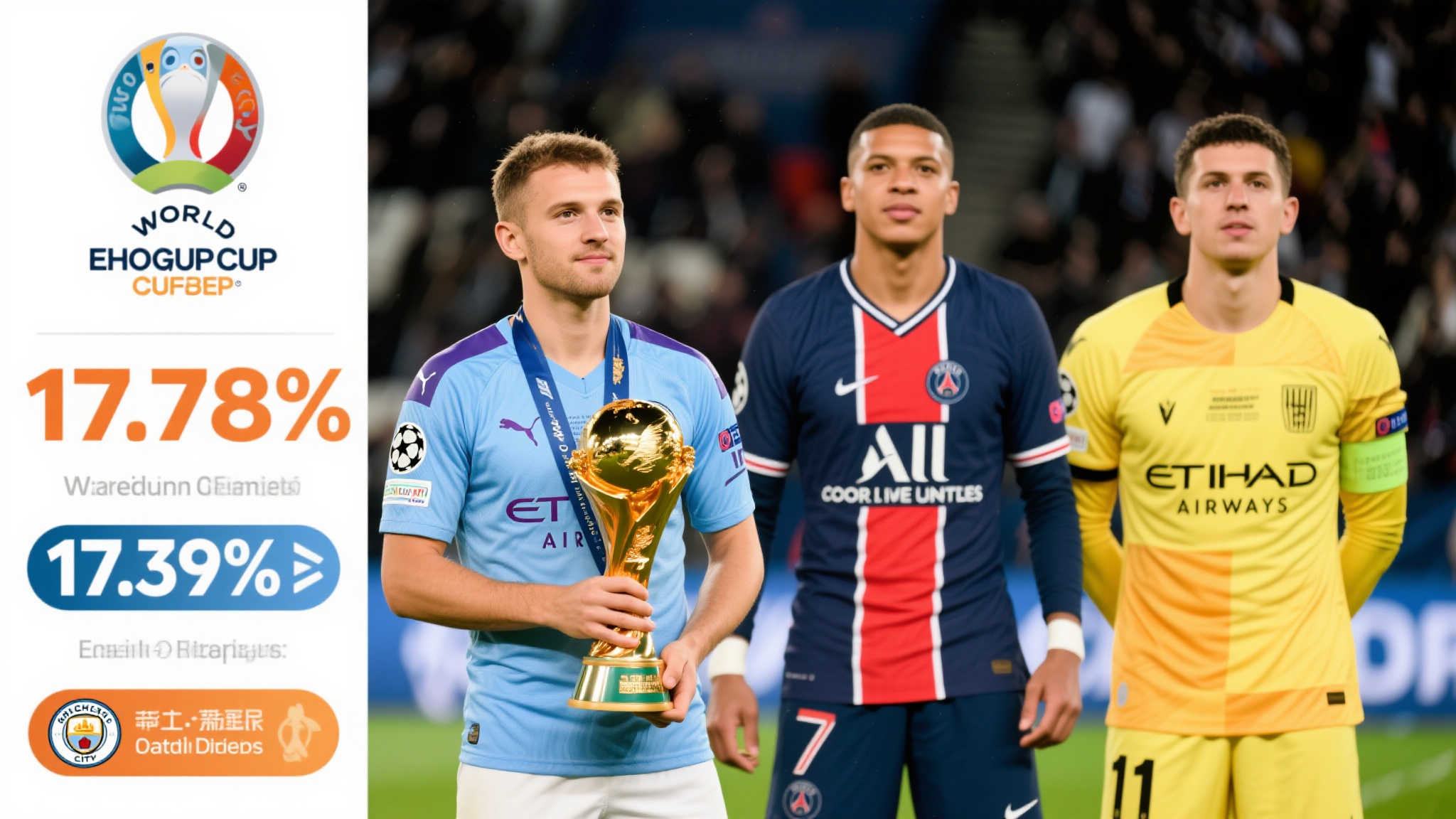 在全球足球迷翘首以盼的世俱杯赛事中,_谁能捧得冠军奖杯_始终是一个备受讨论的话题。今年,各大豪门的表现再次成为焦点。据最新数据分析,英超劲旅曼城以17.78%的概率领跑夺冠榜单,而来自法甲的巴黎圣日耳曼则紧随其后,以17.37%的可能性排在第二。这一结果似乎预示着两支球队在未来赛场上将有精彩对决。